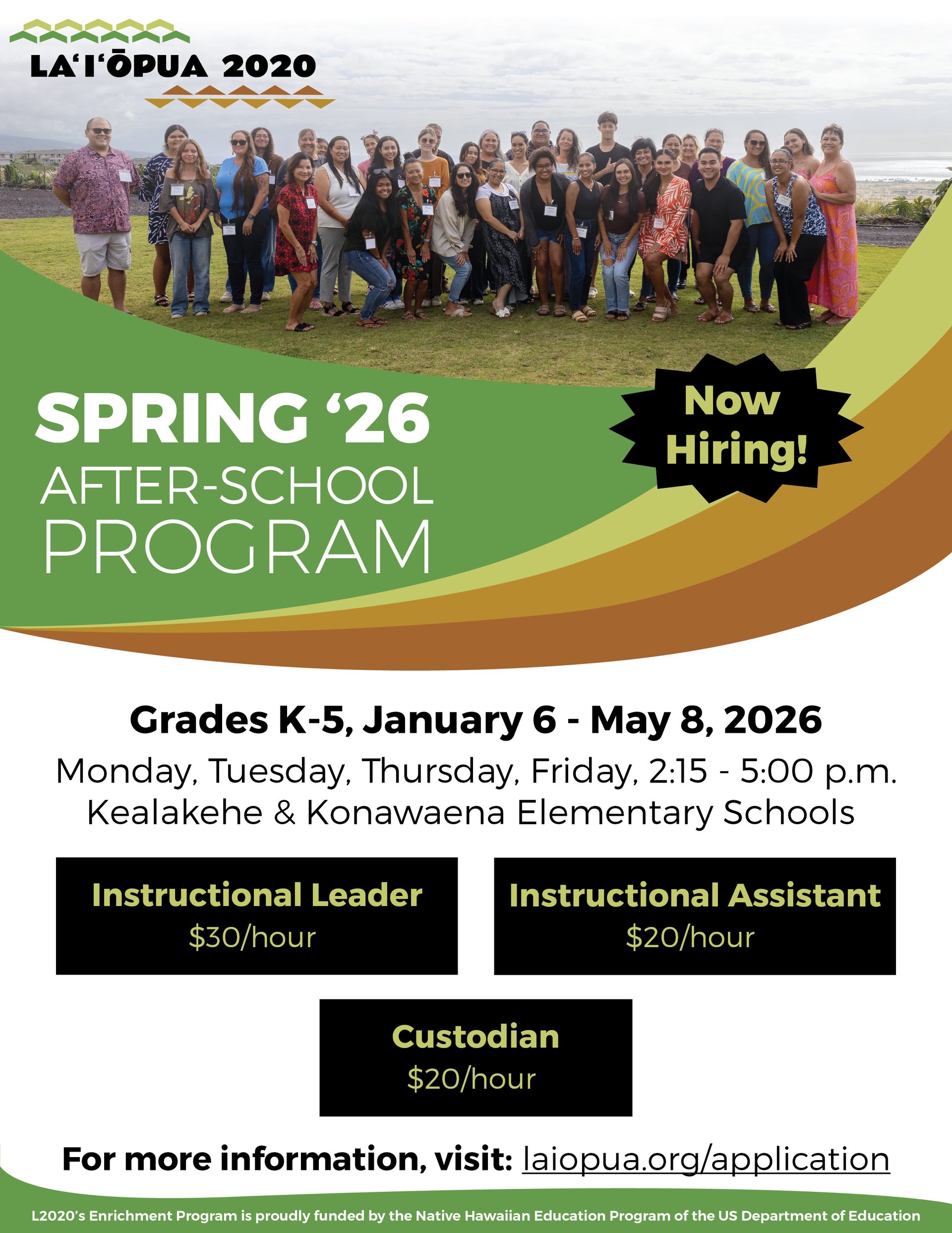 The mission of La‘i‘ōpua 2020 is to identify community needs, foster the creation of community facilities, and coordinate programs for native Hawaiian Homesteaders, Native Hawaiians, and those residing in the greater Kona Coast community. La‘i‘ōpua 2020 has secured a Native Hawaiian Education grant through the USDE to offer afterschool and summer enrichment programs which support academic achievement for students in the Konawaena and Kealakehe Complex areas.