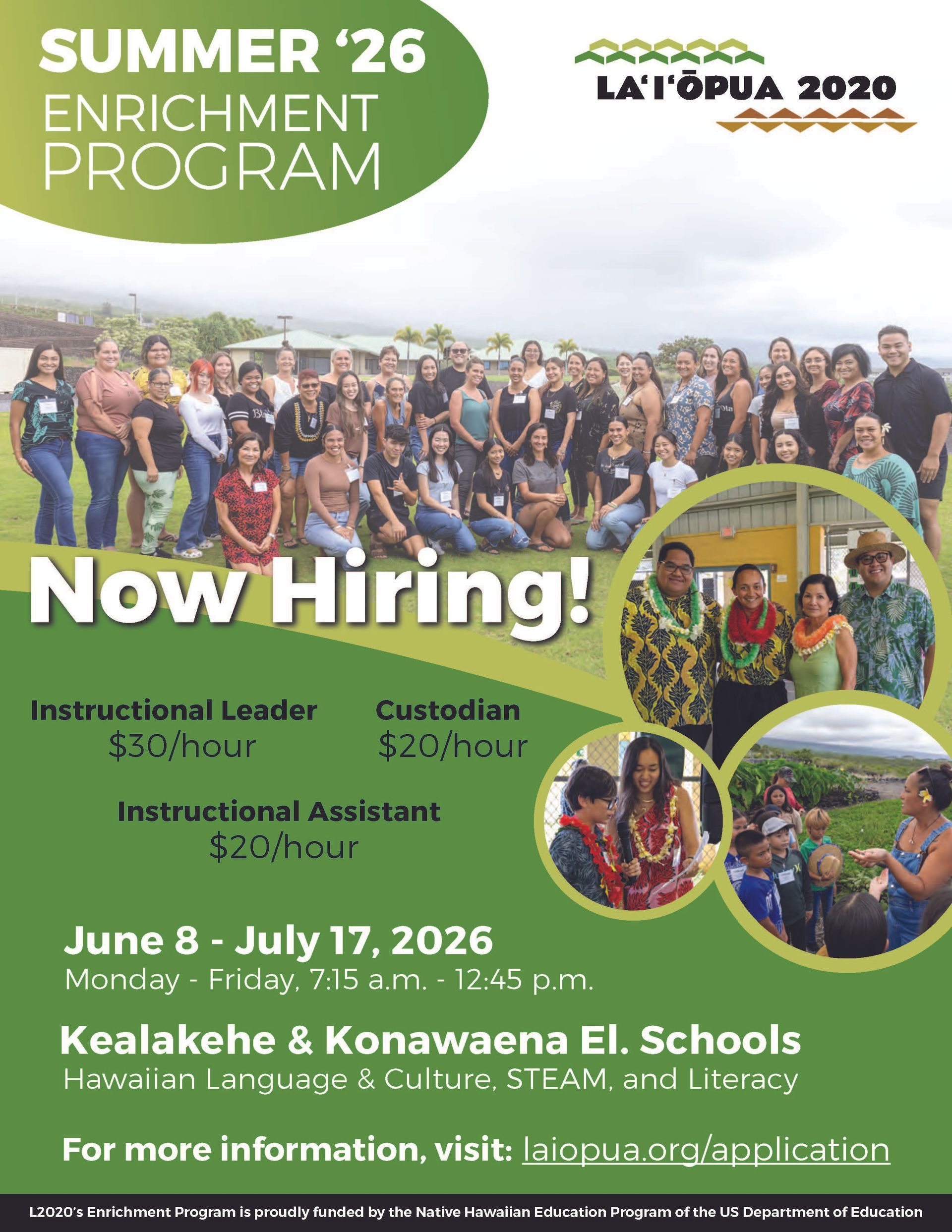 The mission of La‘i‘ōpua 2020 is to identify community needs, foster the creation of community facilities, and coordinate programs for native Hawaiian Homesteaders, Native Hawaiians, and those residing in the greater Kona Coast community. La‘i‘ōpua 2020 has secured a Native Hawaiian Education grant through the USDE to offer afterschool and summer enrichment programs which support academic achievement for students in the Konawaena and Kealakehe Complex areas.