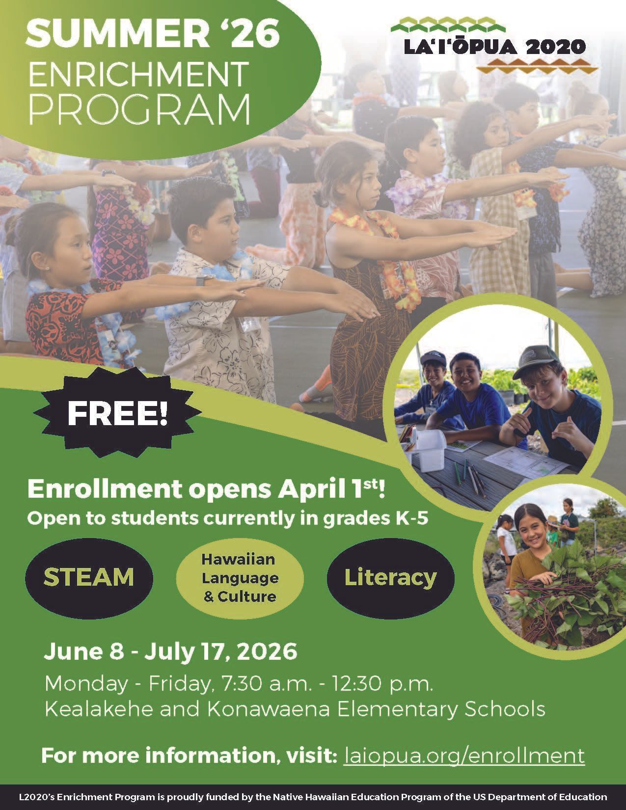 We look forward to sharing this educational enrichment opportunity focused on Hawaiian language/culture, STEAM, and literacy with your family.